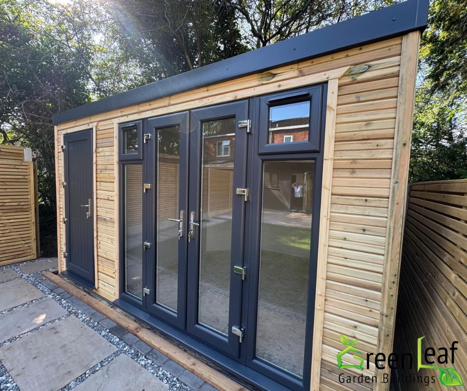 Key features include an internal partition wall, UPVC French doors with full height windows, a UPVC single door, insulation, EPDM rubber roofing and a plaster boarded interior. Additional options such as plastering and electrics were available to tailor the space further.