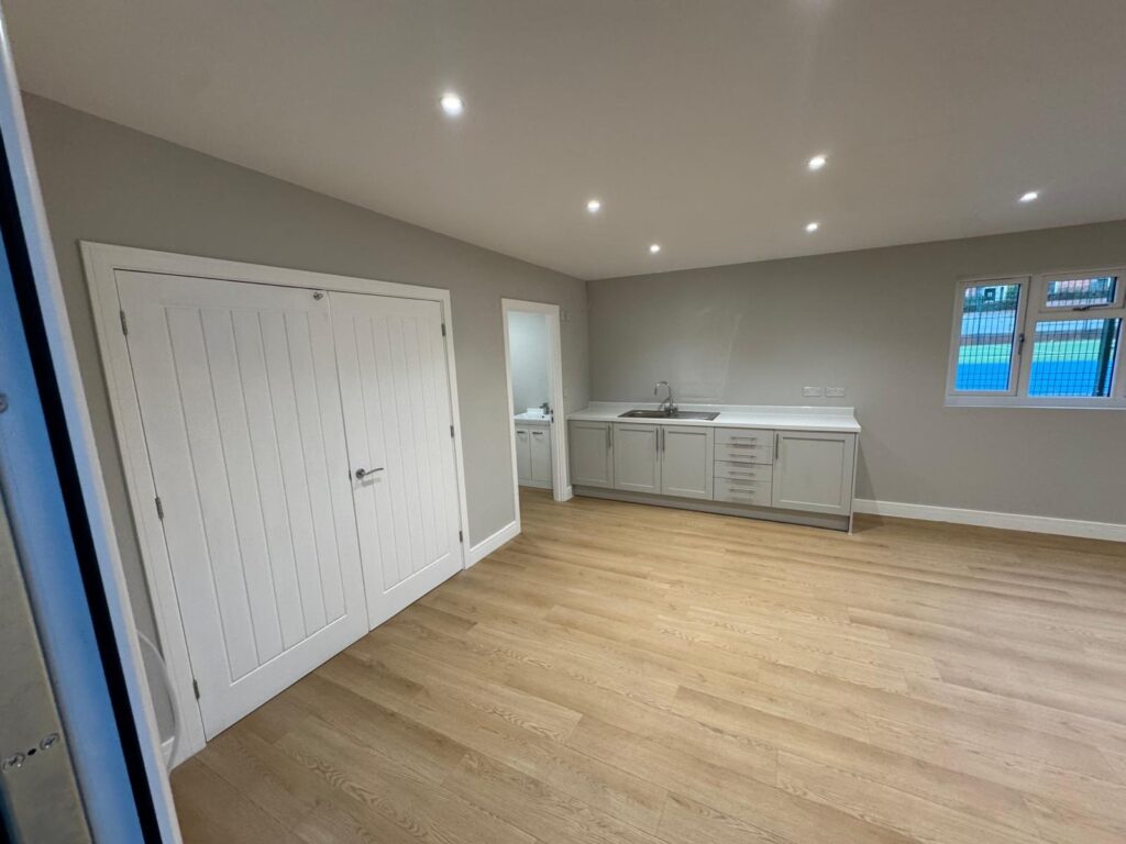 Inside, the room includes partitioned areas for a storage cupboard and toilet, a small kitchenette and full internal and external lighting plus plumbing and drainage. The space is finished with plastered and painted walls along with high quality flooring and skirting.